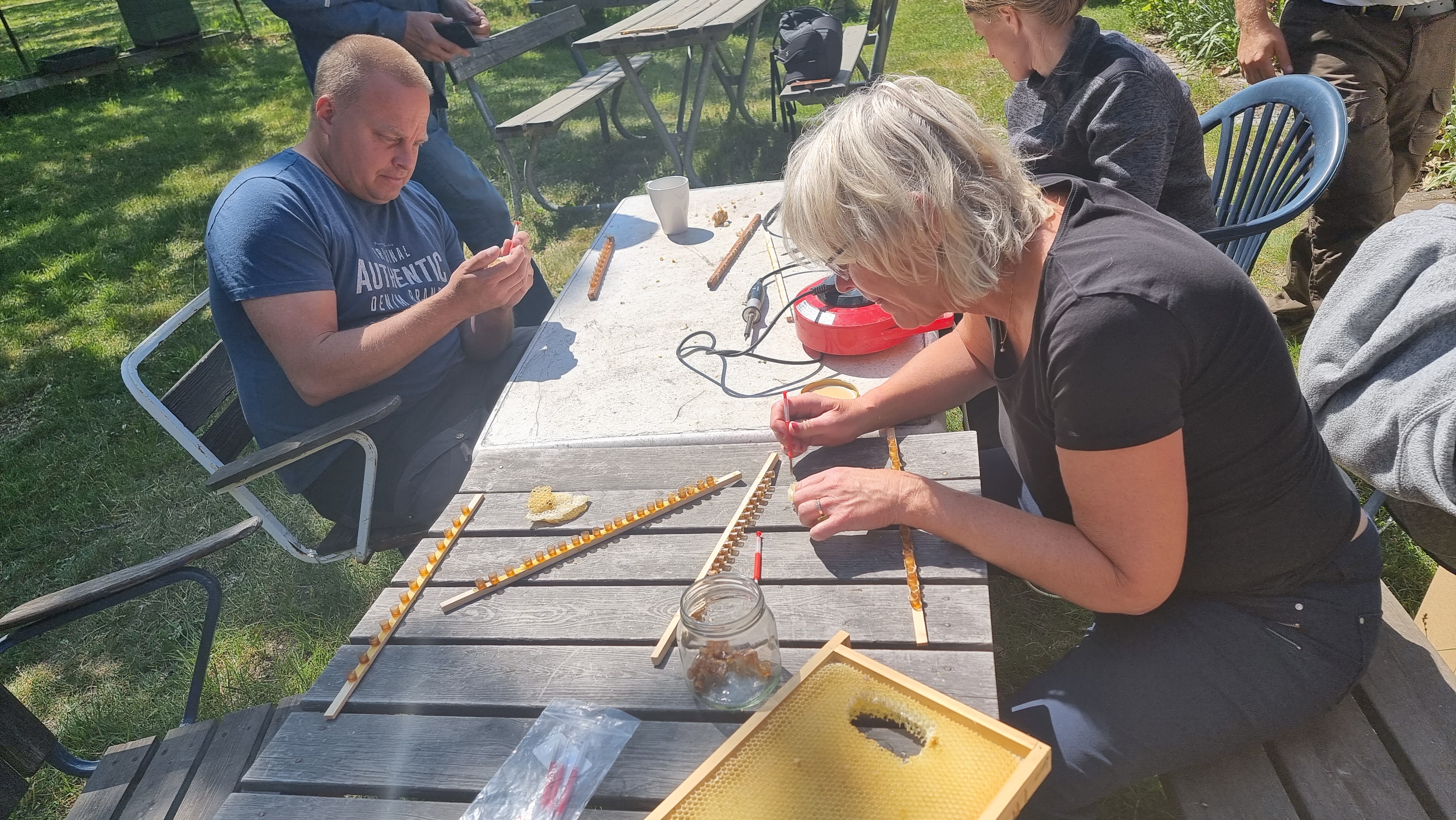 Honungsbedömningen är nu genomförd och resultatet rapporteras till SBR- kansliet. Vi meddelar när det går att beställa etiketter. Den ljusa honungen dominerar, det märks att det är ett stort inslag av raps. Biodlarna vet hur man ympar honungen, den är slät (finkornig) och bredbar. Ett tips till de som väntar med att tappa honungen tills den blir fast. Värm den tillräckligt så att den rinner lätt. Då kan luftbubblor stiga till ytan och det är lättare att få glaskanten fri från honung.